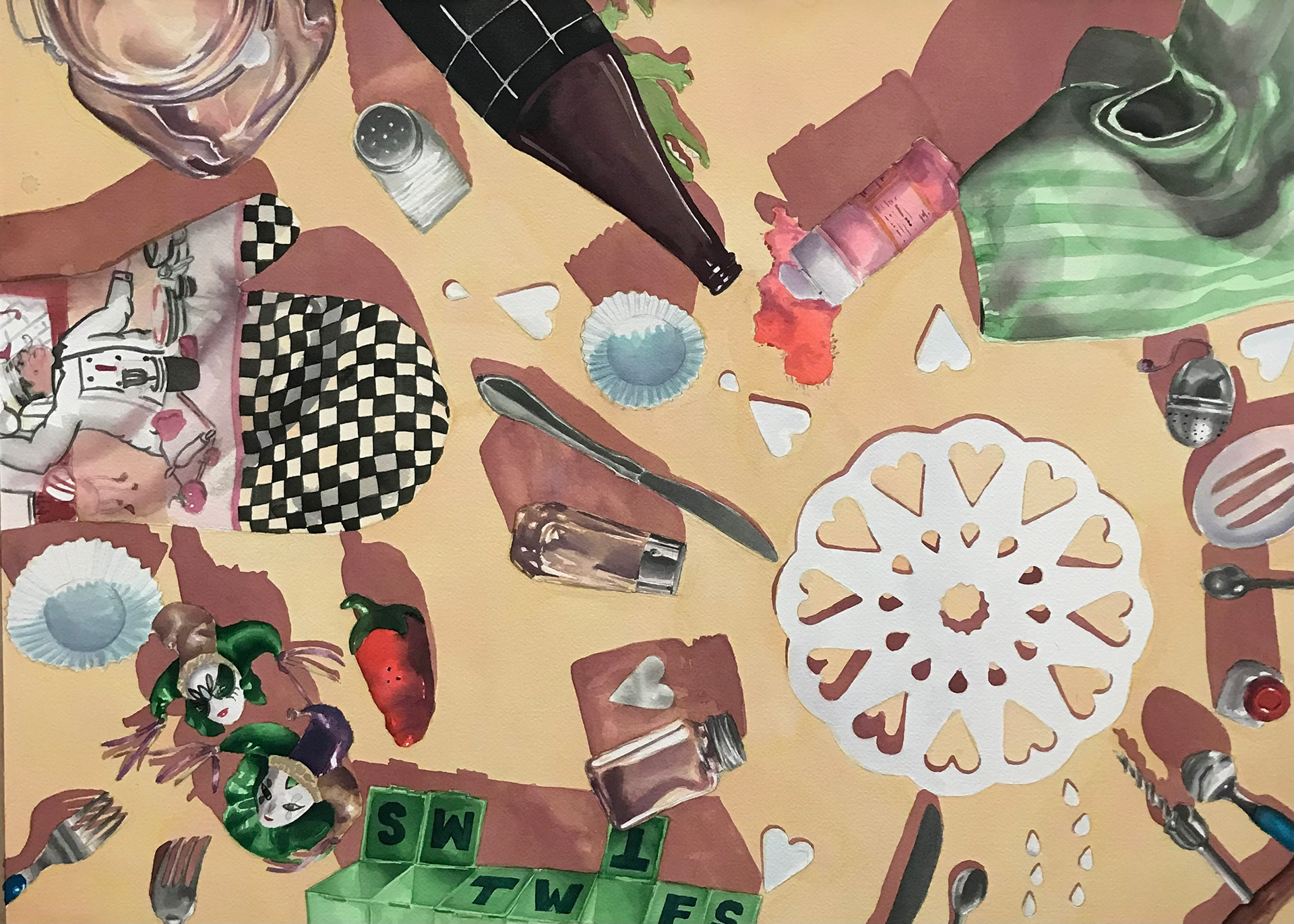 “I spy salt and pepper shakers, and a spoon that’s been rounded to perfection”, 28” x 19 3/4”, Watercolor on cold pressed paper, 2022